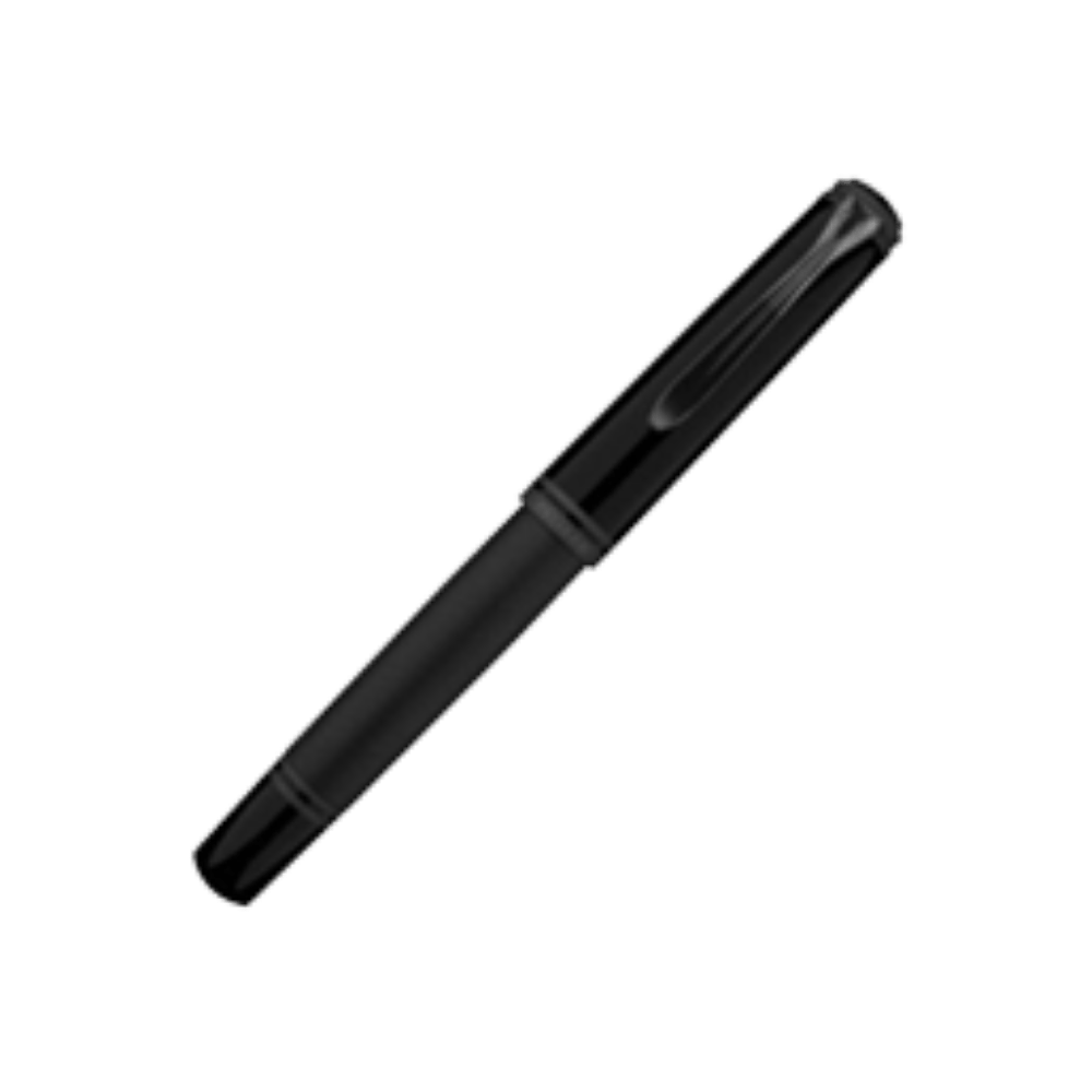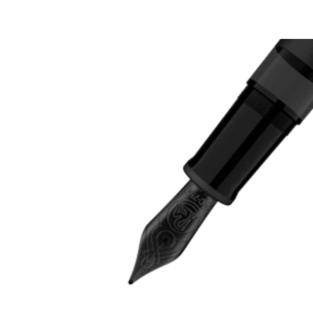 • From the 18-carat gold nib to the body and cap, every detail is finished in matte black, creating a uniform and modern look. The contrast between the satin-finished metal and the high-gloss resin adds depth and visual dynamism, while the slightly smoked ink window is subtly integrated without disrupting the harmony of the design.